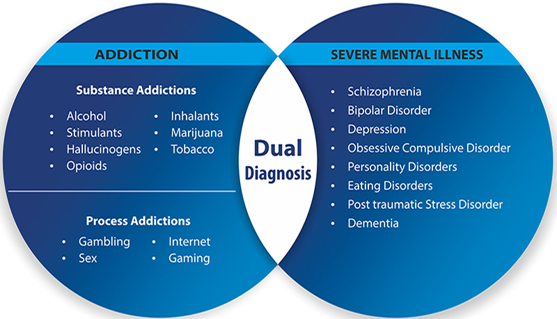 When one experiences a severe mental illness and an addiction (substance abuse) either to alcohol or drugs simultaneously it is called as Dual diagnosis. Either substance abuse or mental illness can develop first. A person with substance addiction can lead to mental health problems because of the effects of drugs on a person’s moods, thoughts, brain chemistry and behavior. Similarly a person with mental illness may turn to drugs and alcohol to improve their troubling mental health symptoms as a form of self-medication which in turn only make the symptoms of mental health conditions worse.